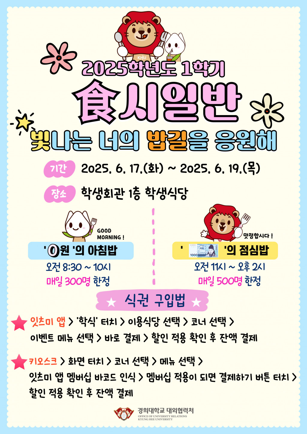 경희대학교는 6월 17일(월)부터 19일(수)까지, 기말고사 기간 동안 졸업 선배와 구성원의 기부로 마련된 아침·점심을 학생들에게 제공했습니다.