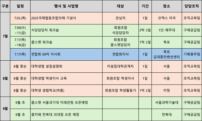 연합회에서는 회원조합의 업무를 보다 효과적으로 지원하기 위해 향후 3개월간의 상세한 일정을 공유할 예정입니다. 이번 일정 공유는 회원조합의 적극적인 참여를 독려하고, 다양한 의견을 수렴함으로써 사업 집행의 효율성을 높이기 위한 취지입니다. 회원 여러분께서는 공유된 일정을 참고하시어 적극적으로 참여해 주시고, 소중한 의견을 통해 협동의 가치를 실현하고 성공적인 한 해를 만들어가기를 기대합니다.