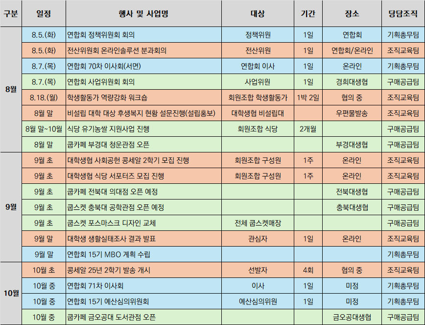연합회에서는 회원조합의 업무를 보다 효과적으로 지원하기 위해 향후 3개월간의 상세한 일정을 공유할 예정입니다. 이번 일정 공유는 회원조합의 적극적인 참여를 독려하고, 다양한 의견을 수렴함으로써 사업 집행의 효율성을 높이기 위한 취지입니다. 회원 여러분께서는 공유된 일정을 참고하시어 적극적으로 참여해 주시고, 소중한 의견을 통해 협동의 가치를 실현하고 성공적인 한 해를 만들어가기를 기대합니다. |